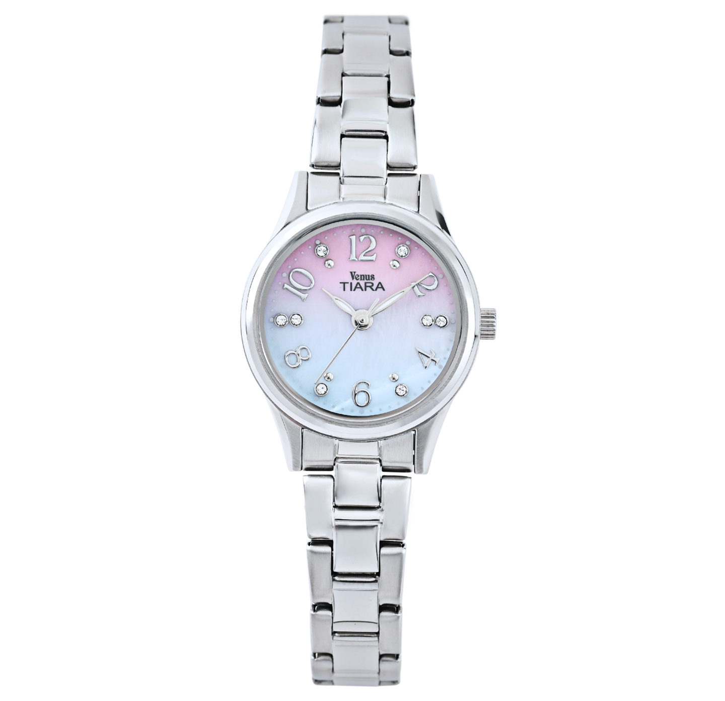 HOME | ALL ITEMS | 26SSmodel | VT102-PKBL VT102-PKBL¥35,200 (税込) [仕様] 駆動方式 電池式クォーツ 携帯精度 平均月差±20秒以内 防水機能 日常生活防水(3気圧) 文字盤カラー ピンクブルー(マザーオブパール) [外装] ケース素材 ステンレススチール バンド素材 ステンレススチール ガラス素材 ミネラルクリスタル ケースサイズ 26.0mm x 32.5mm 腕周りサイズ 最長175mm Color Variation